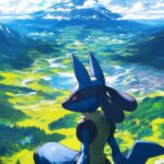 Take a moment of peace with this stunning, scenic wallpaper. It features Lucario in a contemplative pose, sitting on a sun-drenched hill overlooking a beautifully rendered fantasy landscape. The view includes a sparkling blue river flowing through a deep green valley and a charming, medieval-style town nestled in the center. The vast blue sky and fluffy clouds evoke a sense of freedom and adventure. This artwork beautifully merges the world of Pokémon with classical landscape painting, making it a perfect, tranquil choice for your phone’s background.