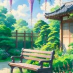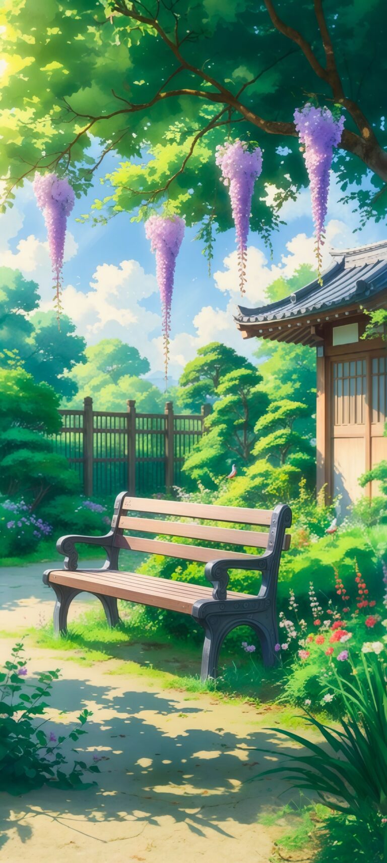 Escape to a tranquil, serene space with this beautiful anime garden wallpaper. A classic wooden park bench is perfectly placed in a lush, sun-drenched garden, surrounded by vibrant greenery and colorful flowers. Overhead, stunning purple wisteria flowers hang from the trees, adding a touch of classic Japanese beauty. The bright, peaceful atmosphere is ideal for a calming, natural aesthetic on your phone. 🌿💜