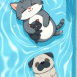 Dive into cuteness with this fun, vibrant cartoon wallpaper! A content gray cat is seen happily floating on its back in a bright blue pool, hugging a tiny black kitten, while a cheerful pug dog floats nearby. The swirling water creates a dynamic, refreshing look. This adorable image is perfect for summer vibes, animal lovers, or anyone who needs a relaxing, feel-good background. ☀️🐾