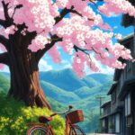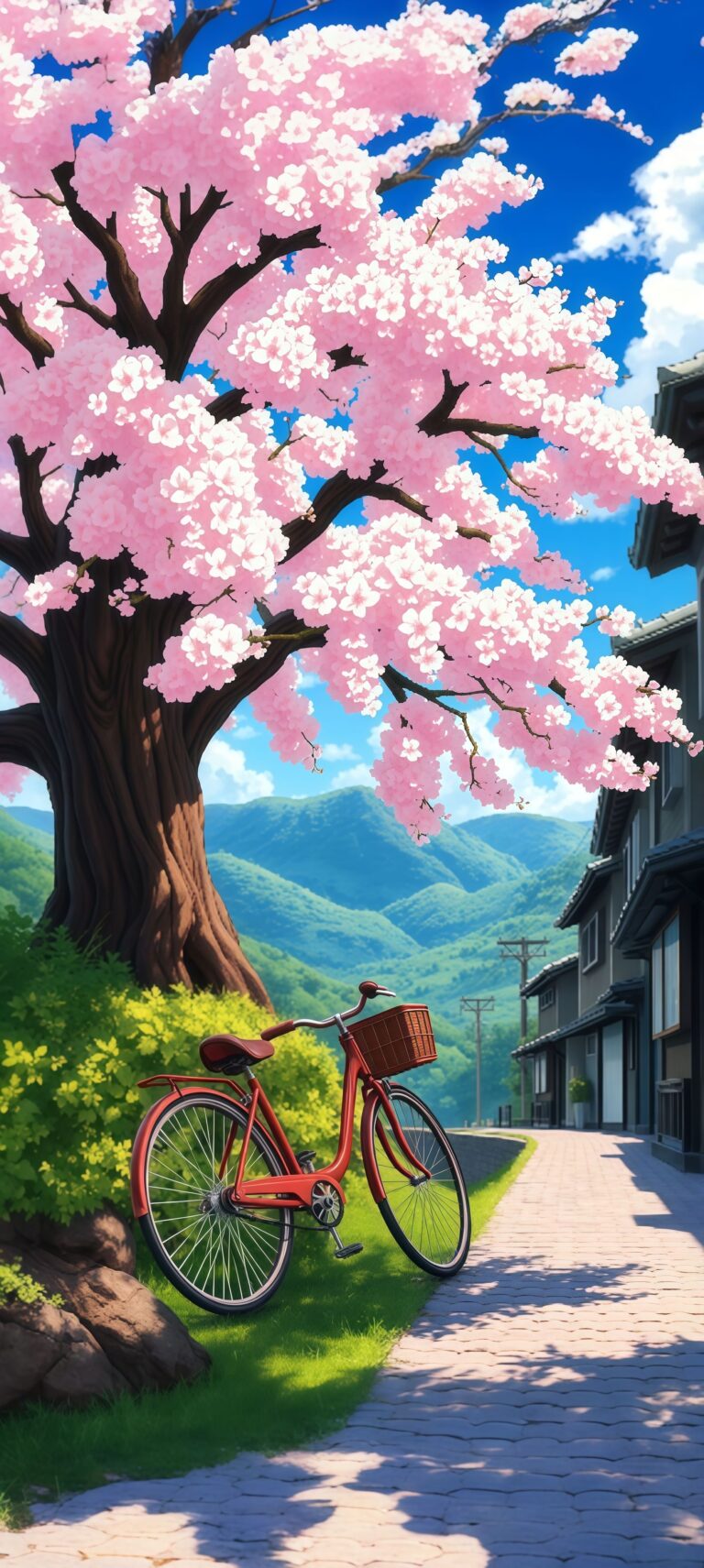Experience the beauty of spring with this stunning anime landscape wallpaper. A magnificent, towering cherry blossom tree with vibrant pink flowers dominates the scene, standing next to a charming stone path. A classic red bicycle with a basket leans on the tree, evoking a peaceful, idyllic journey through a Japanese countryside village with rolling green mountains in the background. A breathtaking background for nature lovers.