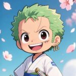 An absolutely adorable and fun chibi anime wallpaper featuring Roronoa Zoro from One Piece. The mini swordsman, with his signature green hair and scar, is shown with a big grin, wearing a traditional white kimono and holding his katanas. The bright blue sky and falling pink cherry blossoms create a charming, sunny, and lighthearted scene. Perfect for fans who love the Straw Hat Pirates and a cute aesthetic!