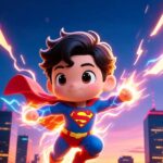 A super-cute and vibrant chibi superhero wallpaper featuring a delightful 3D-rendered Superman. The Man of Steel is flying high above a dazzling, nighttime city skyline at sunset, leaving trails of electric power and light. The exaggerated head, bright colors, and joyful expression give this image a cheerful and energetic feel. An inspiring and adorable background for any Superman fan.