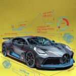 A stunning mobile wallpaper featuring a sleek Bugatti Divo supercar in a grey and blue finish. The car is set against a vibrant yellow background and overlaid with technical blueprint graphics. Key performance stats like 1479 HP, 380 KM/H top speed, and 0-60 MPH in 2.4 SEC are highlighted. This high-tech, stylized car art is perfect for fans of hypercars, automotive engineering, or a bold sports car phone background.