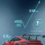 A dynamic phone wallpaper showcasing a powerful Red Porsche GT3 RS (likely 992 generation). The image is stylized with a technical, neon-blue holographic overlay. Detailed performance statistics are highlighted, including 518 HP, 465 NM Torque, 2.8 SEC 0-60 MPH, and race data like lap time and G-Force distribution. This futuristic-style race car art is ideal for automotive enthusiasts, Porsche fans, and a high-performance desktop or mobile background.