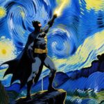 A magnificent mashup of art and comic book culture! This wallpaper reimagines a classic Batman scene in the dramatic, swirling, Post-Impressionist style of Vincent van Gogh’s “The Starry Night.” Batman is standing heroically on a cliff overlooking a stylized cityscape, holding a beacon of light up towards the vibrant, iconic, swirling blue and yellow night sky. It’s a perfect blend of high art and superhero fandom.