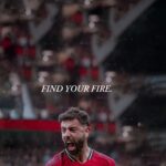 This intense wallpaper features Manchester United’s Bruno Fernandes, captured in a moment of passionate celebration or fierce determination on the pitch, wearing the classic red kit. The overlaying phrase “FIND YOUR FIRE” is a powerful message to ignite your passion and drive. A must-have for devoted Red Devils supporters and those who appreciate the fiery intensity of world-class football. GGMU!