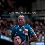 An intense celebration shot for the Chelsea faithful! This wallpaper captures the moment two players, identifiable as Enzo Fernández and Benoit Badiashile, are lifted by the adrenaline of a goal. Their focused, passionate expressions are framed by the powerful, universally motivating quote: “LESS TALK, MORE ACTION.” It’s a bold statement for any fan of the game who values performance over promises.