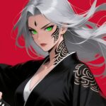 This bold and intense anime wallpaper showcases a powerful female samurai warrior. She has flowing silver hair, piercing green eyes, and intricate black tribal-style tattoos that wrap around her neck and arms. Dressed in a black kimono with gold accents, she holds a gleaming katana sword, set against a striking, plain red background for maximum visual impact.