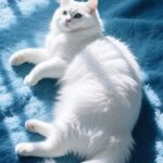 Experience pure tranquility with this serene wallpaper. A gorgeous, fluffy white cat with stunning green eyes is perfectly posed, enjoying a warm sunbeam while resting on a vibrant, soft blue textured rug or blanket. The sunlight highlights the luxurious texture of its long, flowing fur, creating a peaceful and cozy scene. This image is the epitome of comfort and a lovely choice for a calming, beautiful background.