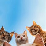 This delightfully funny cat wallpaper captures a moment of pure feline curiosity! Four adorable cats—ranging from a fluffy white face up front to a striped tabby and a ginger kitty—peer down at the lens, creating a hilarious, low-angle “selfie” effect. The bright, clear blue sky background makes their bright eyes and fuzzy faces pop. It’s an absolute must-have for any cat enthusiast looking for a playful and lighthearted screen background.