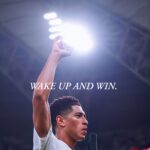 Fuel your drive to succeed with this intense, motivational sports wallpaper. The image shows Jude Bellingham, potentially a Real Madrid player celebrating a victory (the subtle text hints at the Supercopa de España), with his fist raised toward the stadium lights. The inspiring phrase “WAKE UP AND WIN” serves as a powerful call to action. An ideal choice for sports enthusiasts who love the winning spirit of Los Blancos.