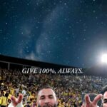 This dynamic football wallpaper captures the intensity of a victory celebration, featuring star player Karim Benzema in his Al-Ittihad jersey. He’s striking a pose in front of a roaring crowd of yellow-clad fans, with the image dramatically set beneath an epic, star-filled night sky. The inspirational text “GIVE 100%, ALWAYS.” is overlaid, making this a perfect motivational background for any sports enthusiast or fan of the legendary striker.