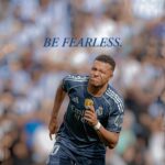 Get pumped up with this dynamic sports wallpaper capturing a Kylian Mbappé mid-run on the pitch, wearing the dark blue kit. The intense, focused action shot is paired with the short, powerful command: “BE FEARLESS.” This image is a fantastic source of motivation for exercise, competition, or simply tackling life’s challenges without hesitation. A high-energy wallpaper for your daily grit.