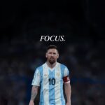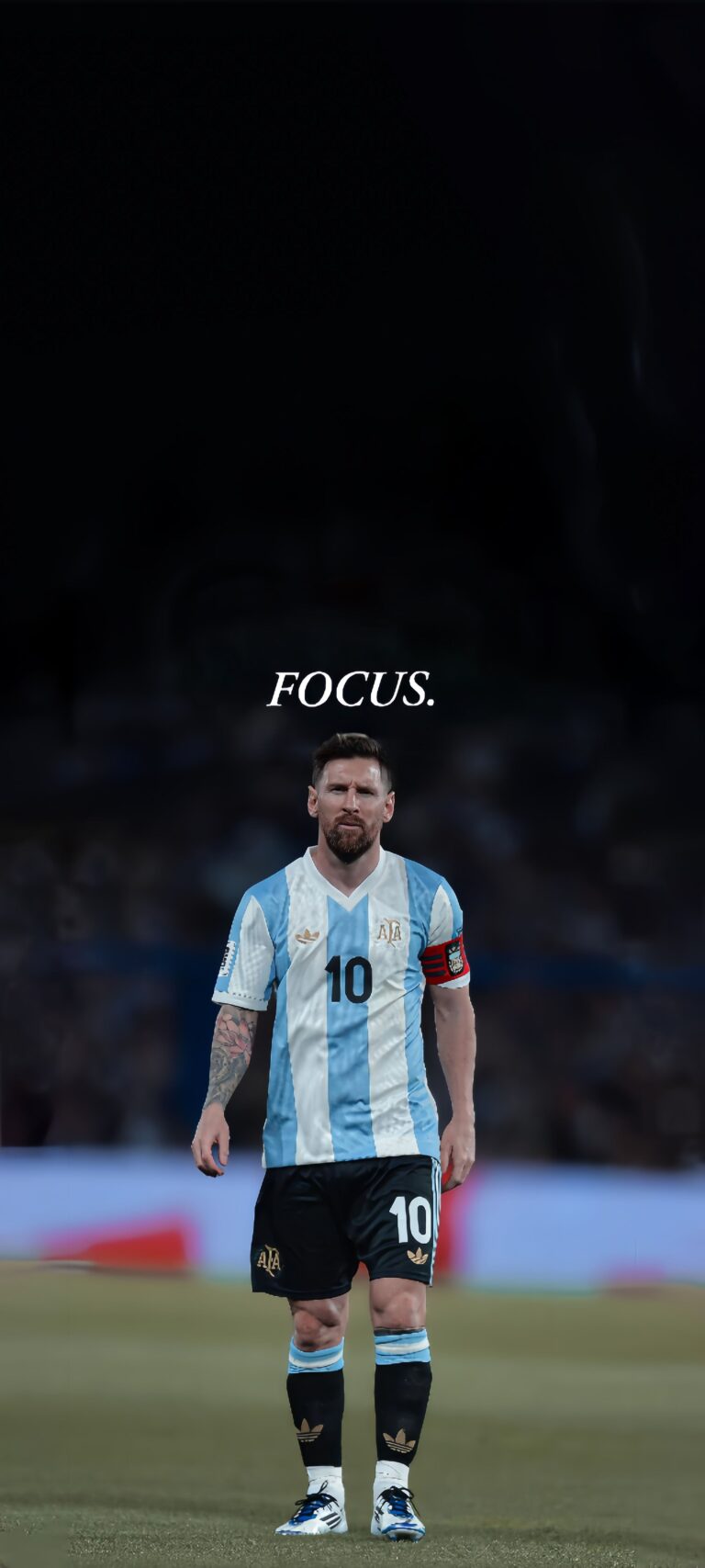 Command concentration with this image of the legendary Lionel Messi. Captured on the pitch in his iconic light blue and white Argentina jersey, he stands with an air of immense focus and determination. The simple, yet profound, word “FOCUS.” above him is all the inspiration needed to channel his greatness. This wallpaper is essential for fans and anyone who values deep concentration and a singular drive toward goals. concentración