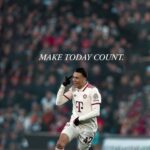 Capture the rush of match day with this inspirational wallpaper featuring Bayern Munich’s Mathys Tel. The young star is caught mid-celebration, pointing to his head while looking out at a blurry crowd of fans, symbolizing focus and success. The elegant text “MAKE TODAY COUNT.” is perfectly placed above him, turning a moment of sporting triumph into a daily call to action.