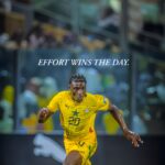 This wallpaper is a tribute to hard work and determination! It features a dynamic shot of Mohammed Kudus from the Ghana National Football Team in his signature yellow jersey, sprinting across the pitch with the ball, fully engaged in the game. The quote “EFFORT WINS THE DAY.” is a strong, powerful message that makes this a perfect choice for athletes and anyone driven by hustle and persistence.