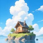 A wonderfully serene and calming wallpaper that captures the essence of peaceful isolation. A small, cozy wooden cabin with a porch sits atop a tiny, grassy island surrounded by a calm, reflective lake. The bright blue sky is adorned with large, fluffy white clouds, and the entire scene is mirrored perfectly in the still water below, creating a balanced and tranquil landscape.