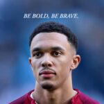 Elevate your motivation with this striking wallpaper featuring professional football player Trent Alexander-Arnold of Liverpool FC (The Reds). The image captures his focused expression, dressed in the iconic maroon kit, with the powerful mantra “BE BOLD, BE BRAVE” overlaid. Perfect for fans of the English defender and anyone seeking a daily reminder to face challenges with courage and conviction. YNWA!