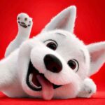Say hello to the super-dog himself, Bolt, the hero from Disney’s 2008 film! This wallpaper captures his pure, infectious happiness as he lies on his back with a wide-open smile and his tongue out, giving a playful wave with his paw. His brilliant white fur pops against the energetic solid red background. It’s a vibrant, joyful image that’s perfect for any fan of this loyal and lovable canine. Pure puppy joy! 🐶❤️