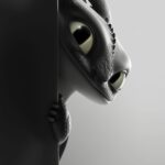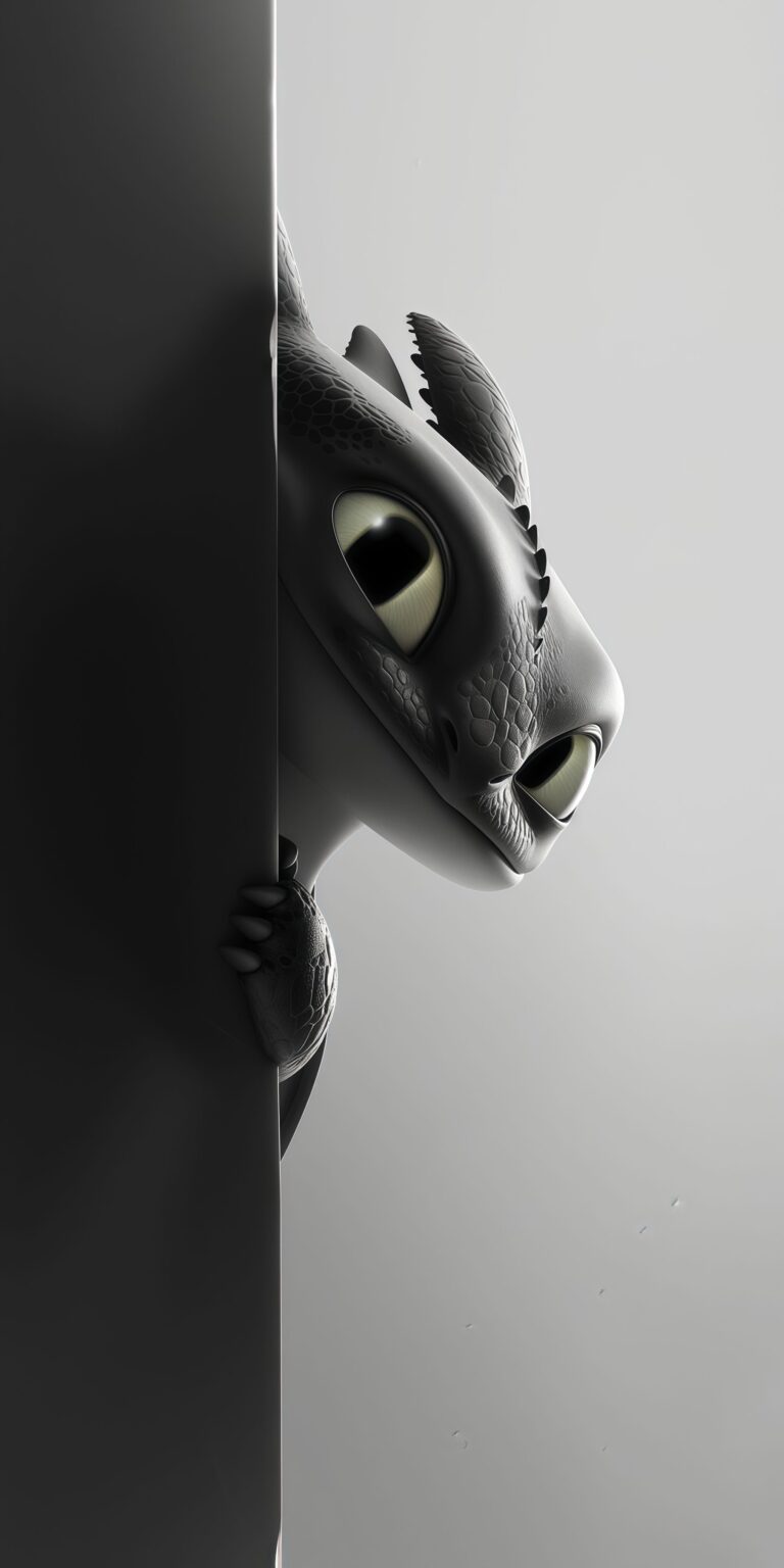 Who can resist this adorable Night Fury? This minimalist wallpaper features Toothless from How to Train Your Dragon, playfully peeking out from behind a dark edge. His signature large, curious green eyes are the focus, contrasting with his dark, scaly head and the bright, fading grey background. It’s a perfect subtle nod to your favorite dragon! The best dragon friend!