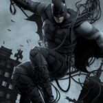 Swoop into the shadowy streets of Gotham with this incredibly dark and atmospheric wallpaper of the Batman. The Caped Crusader is shown mid-swing, descending on a thick grappling rope that adds a prominent, dynamic textural element to the scene. His tactical suit is highly detailed, almost resembling a woven, chainmail-like texture that enhances the realistic, gritty feel. Bats fly against the stormy, rain-swept sky, illuminated by the distant city lights below, perfectly capturing the brooding, high-stakes atmosphere of the Dark Knight’s world. This is a must-have for fans of the grounded, serious take on the legendary DC hero.