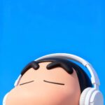 Bring a dose of fun and relaxation to your screen with this super cute wallpaper featuring the iconic character, Shin-chan (Crayon Shin-chan). The close-up shot shows the little boy with his eyes blissfully closed, enjoying his music through stylish white headphones against a vibrant, clear blue sky. It’s a clean, joyful, and charming design perfect for fans of the beloved anime.