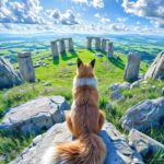 This wonderfully unique wallpaper blends the ancient and the adorable! A beautiful, fluffy fox sits serenely on a rock, its long tail draped behind it, gazing over the vast green landscape towards the famous Stonehenge monument. The scene is bathed in brilliant, natural light under a bright blue, cloudy sky, giving it a peaceful, majestic, and slightly fantastical feel.