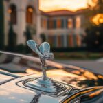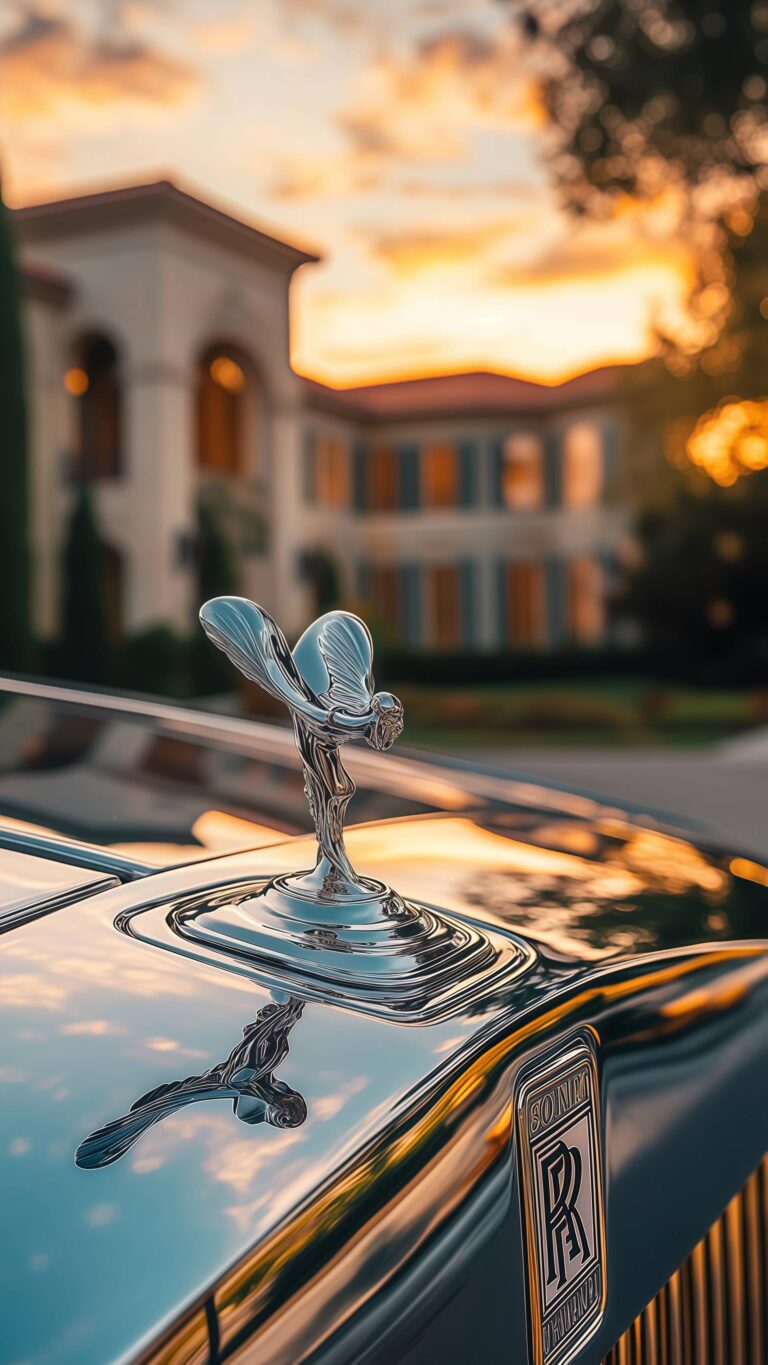 Behold the ultimate symbol of automotive luxury. This striking Rolls-Royce wallpaper focuses intimately on the famous Spirit of Ecstasy hood ornament, its chrome surface reflecting a breathtaking golden sunset. In the blurred background, an opulent mansion completes the scene of extravagance and class. It’s a sophisticated, detailed close-up shot that captures the wealth and heritage of the luxury car brand.