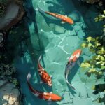 Achieve instant tranquility with this beautiful and serene wallpaper. It features a top-down view of several elegant orange and white Koi fish gracefully swimming in a crystal-clear, emerald-toned pond. Sunlight dapples the water’s surface, reflecting off the fish and the surrounding lush green foliage and mossy rocks, creating a peaceful Zen garden ambiance. This digital painting is a perfect, calming aesthetic for any device.