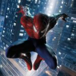 Swing into action with this high-impact Spider-Man wallpaper! The image perfectly captures the iconic web-slinger mid-air, framed against the towering, neon-lit skyscrapers of a modern city at night. The pose and suit strongly evoke the classic Raimi trilogy era of Spider-Man, delivering a thrilling, larger-than-life superhero aesthetic right to your phone screen. A must-have for every Spidey fan!