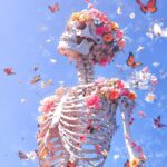 A beautifully ethereal and surreal wallpaper featuring a full-body skeleton adorned with bright, colorful flowers and surrounded by butterflies against a clear blue sky. It’s a striking and vibrant take on the concept of life, death, and nature.