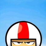 A simple but iconic wallpaper of the fearless cartoon star Kick Buttowski from the Disney XD show Suburban Daredevil. His signature white helmet with a red stripe and determined scowl are set against a clear blue sky, capturing his daredevil attitude.