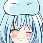 A close-up, playful wallpaper featuring the protagonist Rimuru Tempest from That Time I Got Reincarnated as a Slime (TenSura). He’s smiling mischievously with a cute, squishy slime on his head, set against a soft, icy blue background. Ideal for fans who love the adorable side of the powerful Tempest.