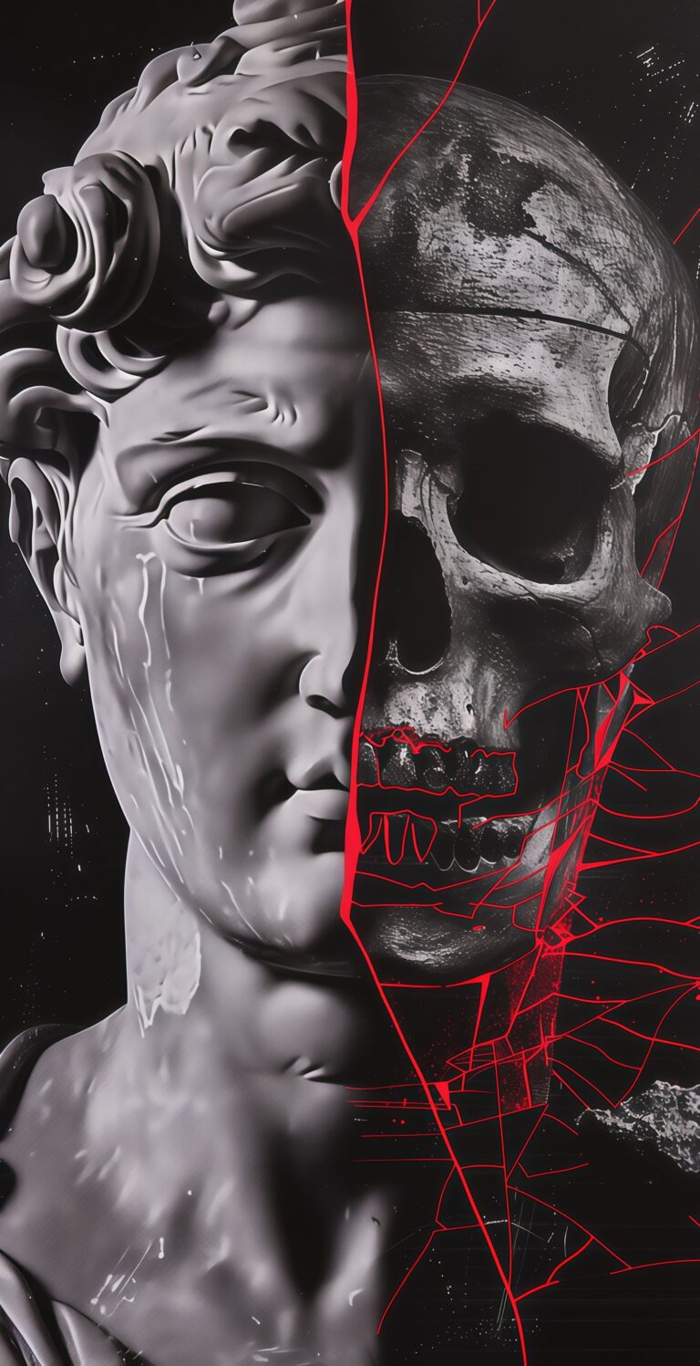 A deep, dramatic wallpaper combining classical artistry with dark themes, featuring a split image of a white Greek statue face and a broken skull with jagged red cracks. This surreal and contrasting piece explores themes of mortality and inner turmoil. 💀🗿