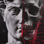 A deep, dramatic wallpaper combining classical artistry with dark themes, featuring a split image of a white Greek statue face and a broken skull with jagged red cracks. This surreal and contrasting piece explores themes of mortality and inner turmoil. 💀🗿