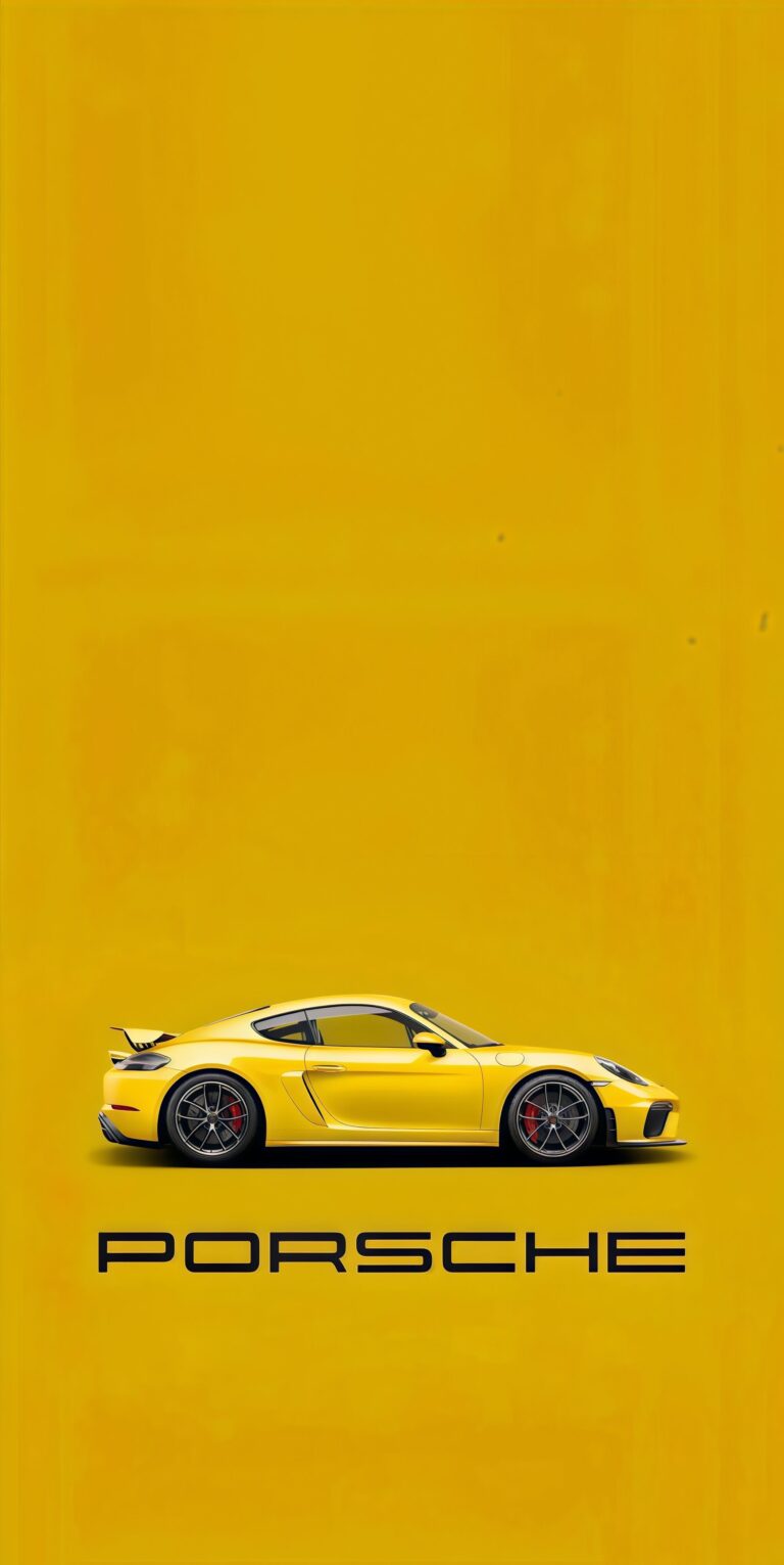Capture the essence of speed and luxury with this stunning minimalist yellow Porsche wallpaper. A crisp, side profile of a Porsche 718 Cayman is the central focus, set against a vibrant, solid yellow background. The clean lines and bold color make the German sports car an eye-catching piece of art, with the ‘PORSCHE’ logo grounding the image at the bottom. The perfect high-energy backdrop for any car enthusiast.