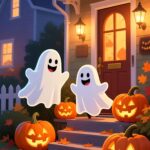 Prepare for a super cute, not-too-spooky Halloween! This wallpaper features a welcoming front porch decorated for the season with large, glowing jack-o’-lanterns and scattered autumn leaves. The stars of the show are two adorable cartoon ghosts with cheerful smiles, floating playfully on the steps. It’s the perfect blend of cozy fall decor and gentle Halloween fun.