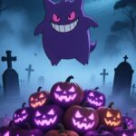A fantastic choice for Pokémon fans! The formidable Ghost-type Pokémon, Gengar, is front and center, grinning menacingly above a massive pile of intensely glowing purple pumpkins in a spooky graveyard. The full moon and heavy fog set a fun, eerie scene for the Halloween season. 👾🌕