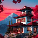 A breathtaking, vibrantly colored Japanese scene that evokes peace and beauty. A traditional house sits on a rocky bluff, framed by brilliant red cherry blossoms, all set against the majestic, snow-capped Mount Fuji. The sky is painted in gorgeous pink and blue tones, capturing a perfect moment of tranquil nature. 🌸🗻