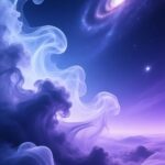 Gaze upon a breathtaking, ethereal landscape where the cosmos meets the earth. A deep, star-filled night sky is dominated by a distant, glowing spiral galaxy and a brilliant nebula. Below, vast, swirling clouds of translucent, glowing smoke in shades of indigo, violet, and electric blue drift over a shadowed terrain, creating an otherworldly, mysterious, and awe-inspiring scene. It’s a journey into a tranquil, cosmic dreamscape.