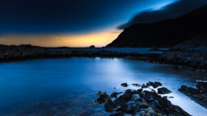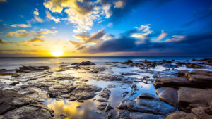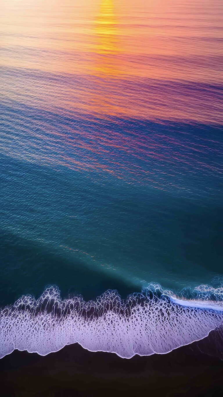 This gorgeous wallpaper provides a unique, high-angle aerial view of the ocean where the rich, patterned blue and teal waves meet the shore. The foamy white waves create a dynamic border with the dark sand. Above, the sky and water reflect a mesmerizing sunset gradient of warm oranges, pinks, and purples, creating a striking contrast. It’s a visually spectacular piece that brings the serene beauty of a seaside sunset to your screen. Aerial Photography 🌊🌅
