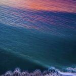 This gorgeous wallpaper provides a unique, high-angle aerial view of the ocean where the rich, patterned blue and teal waves meet the shore. The foamy white waves create a dynamic border with the dark sand. Above, the sky and water reflect a mesmerizing sunset gradient of warm oranges, pinks, and purples, creating a striking contrast. It’s a visually spectacular piece that brings the serene beauty of a seaside sunset to your screen. Aerial Photography 🌊🌅