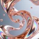 This dynamic wallpaper features a mesmerizing, flowing sculpture of rose gold liquid metal. The smooth, twisting ribbon shape has a high-shine, reflective surface that catches the light, creating incredible iridescent flashes of rainbow color—holographic greens, pinks, and blues. Small, perfect spheres of the same metallic substance float around the central swirl, adding depth and motion to this luxurious, high-end abstract design. A true feast for the eyes! 🌀🌟