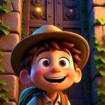A wonderfully rendered 3D animated illustration captures the moment of a young, enthusiastic explorer ready for adventure. The boy, with his wide, hopeful eyes and a big grin, wears a classic safari hat and backpack, standing directly in front of a massive, moss-covered ancient stone doorway. The lush jungle setting with creeping vines and the warm light emanating from the doorway hints at a mysterious discovery awaiting. This is the perfect background for anyone who loves adventure, discovery, and animated charm. 🗺️🧭