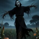 A stunning juxtaposition of seasonal beauty and terror, this Halloween wallpaper presents the infamous Ghostface in an atmospheric autumn forest. He stands draped in his signature black hooded cloak, appearing ominous against a soft, misty background. The forest floor and surrounding trees are rich with the warm colors of fall, featuring a carpet of orange and yellow fallen leaves. The lighting is soft and diffused by the fog, giving the whole scene a moody, cinematic feel that perfectly merges spooky horror with a beautiful seasonal aesthetic.