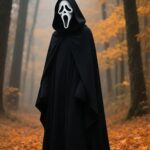 For fans of horror movie nostalgia, this is a chilling Halloween wallpaper. It depicts the terrifying figure of Ghostface, the iconic killer from the Scream franchise, twisted into a macabre scarecrow in a shadowy cornfield. His classic white mask and black hooded cloak are unnerving under a dramatic, swirling full moon and a foreboding night sky. His arms are stretched out like gnarled, spooky branches, and the base of the scarecrow is formed by dark, twisting vines, flanked by grinning, glowing Jack-o’-lanterns for an extra layer of spooky atmosphere.