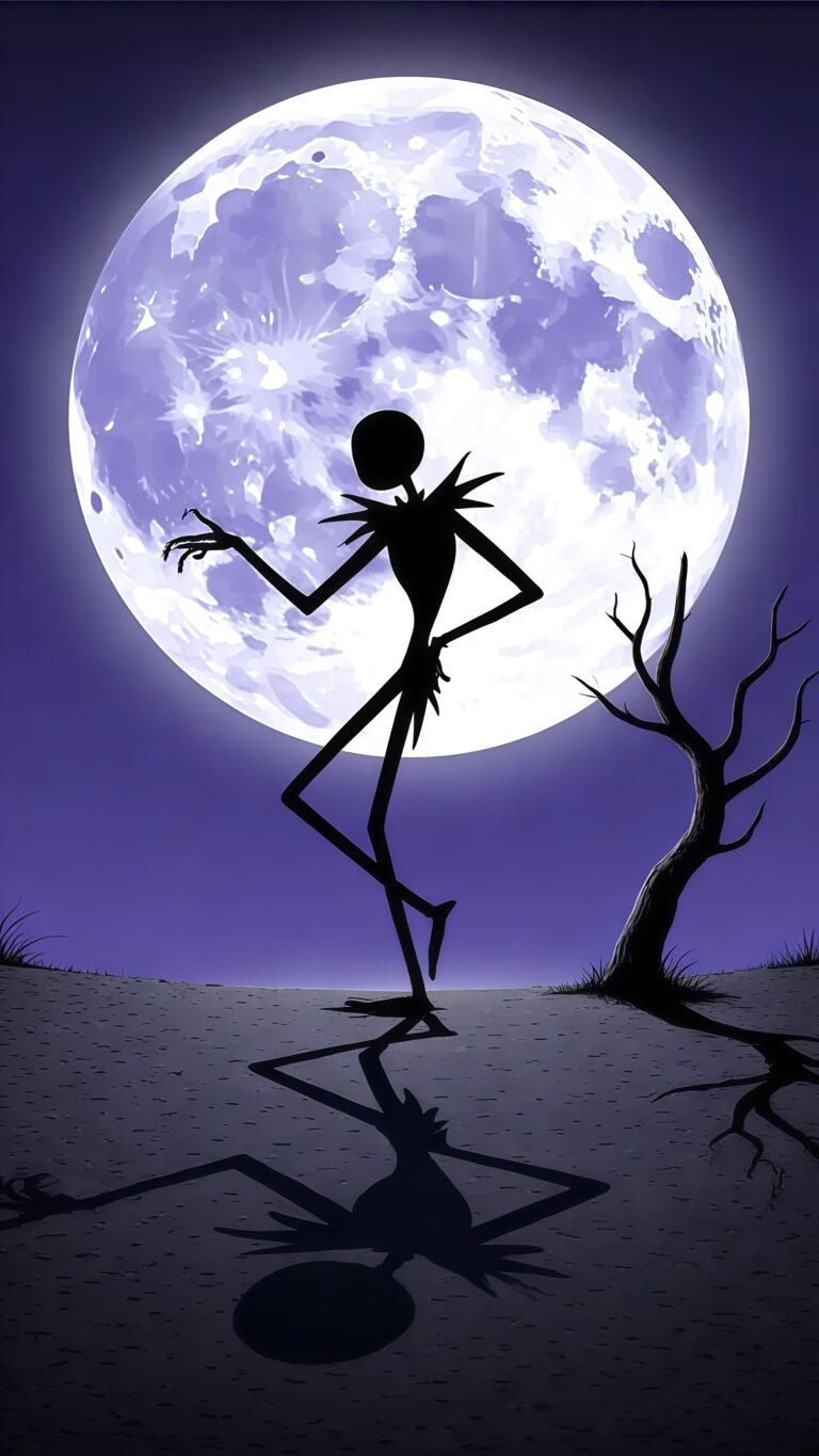 For a sleek and spooky look, this striking Halloween wallpaper presents a dramatic silhouette of Jack Skellington, the Pumpkin King, against a massive, intensely glowing purple full moon. The minimalist, high-contrast design emphasizes his iconic, lanky form and makes a bold, gothic statement. It’s a fantastic choice for a dark, stylish, and instantly recognizable Halloween background.