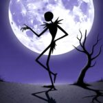 For a sleek and spooky look, this striking Halloween wallpaper presents a dramatic silhouette of Jack Skellington, the Pumpkin King, against a massive, intensely glowing purple full moon. The minimalist, high-contrast design emphasizes his iconic, lanky form and makes a bold, gothic statement. It’s a fantastic choice for a dark, stylish, and instantly recognizable Halloween background.