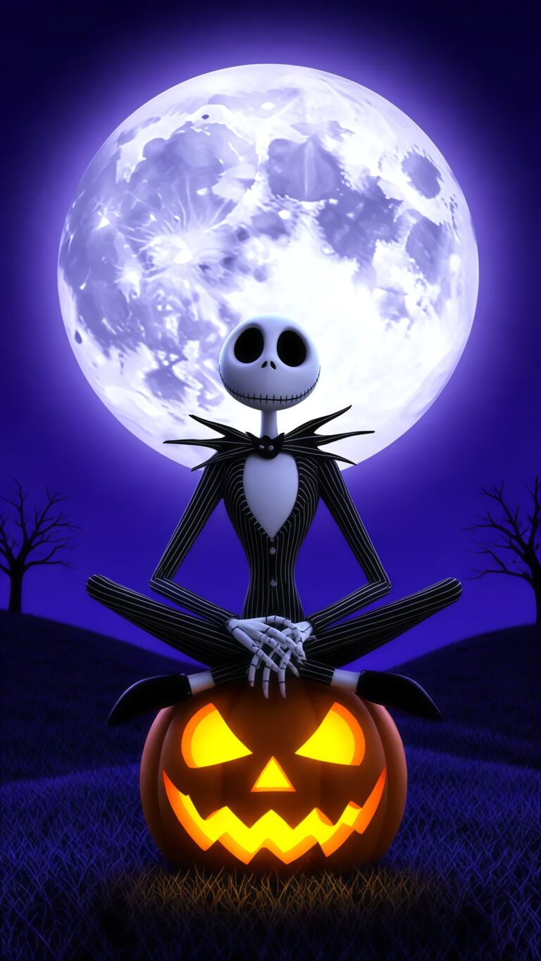 Embrace the spirit of Halloween Town with this striking, minimalist wallpaper. The image presents Jack Skellington in a stylized, cross-legged pose of contemplation, seated firmly on a brightly glowing jack-o’-lantern. The scene is dominated by a majestic, deep purple full moon, highlighting the iconic black and white suit of the Pumpkin King. It’s an essential Halloween wallpaper for any fan of the classic movie.
