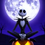 Embrace the spirit of Halloween Town with this striking, minimalist wallpaper. The image presents Jack Skellington in a stylized, cross-legged pose of contemplation, seated firmly on a brightly glowing jack-o’-lantern. The scene is dominated by a majestic, deep purple full moon, highlighting the iconic black and white suit of the Pumpkin King. It’s an essential Halloween wallpaper for any fan of the classic movie.